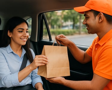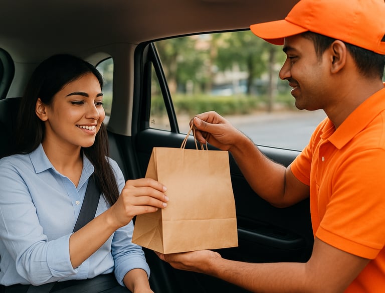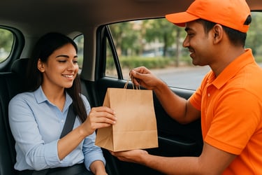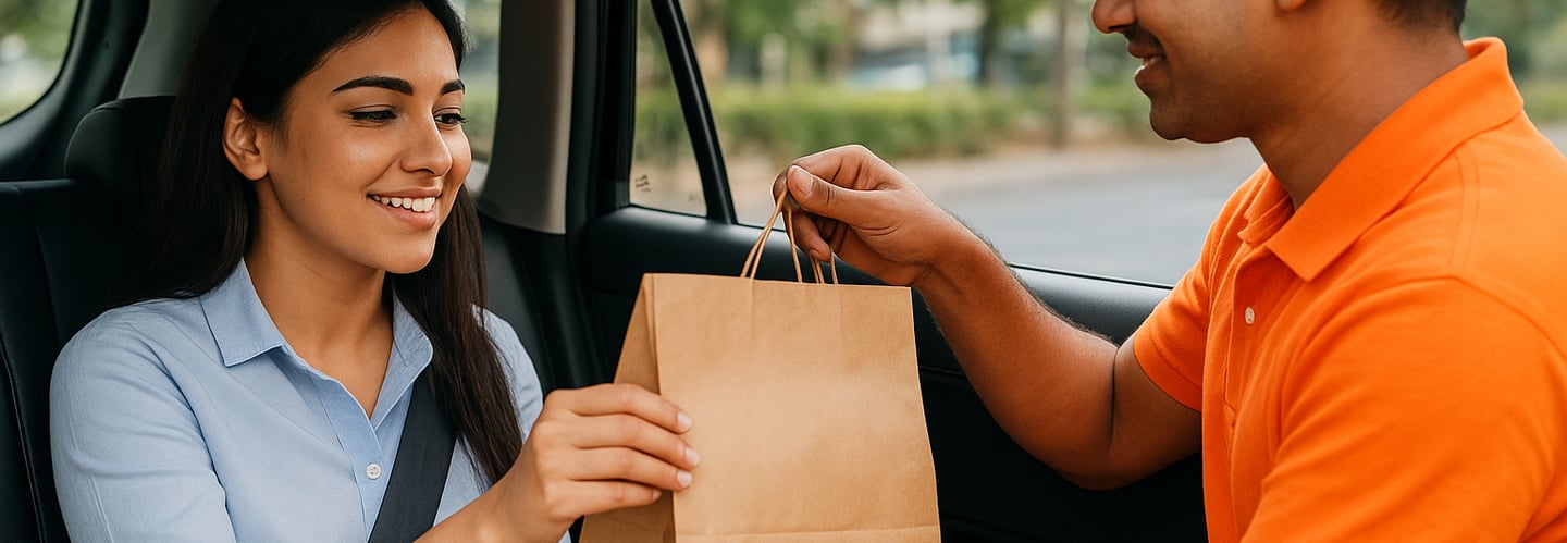 Fresh fruits, snacks, tea, coffee, juices & fast food—delivered to your taxi at the pickup point.
